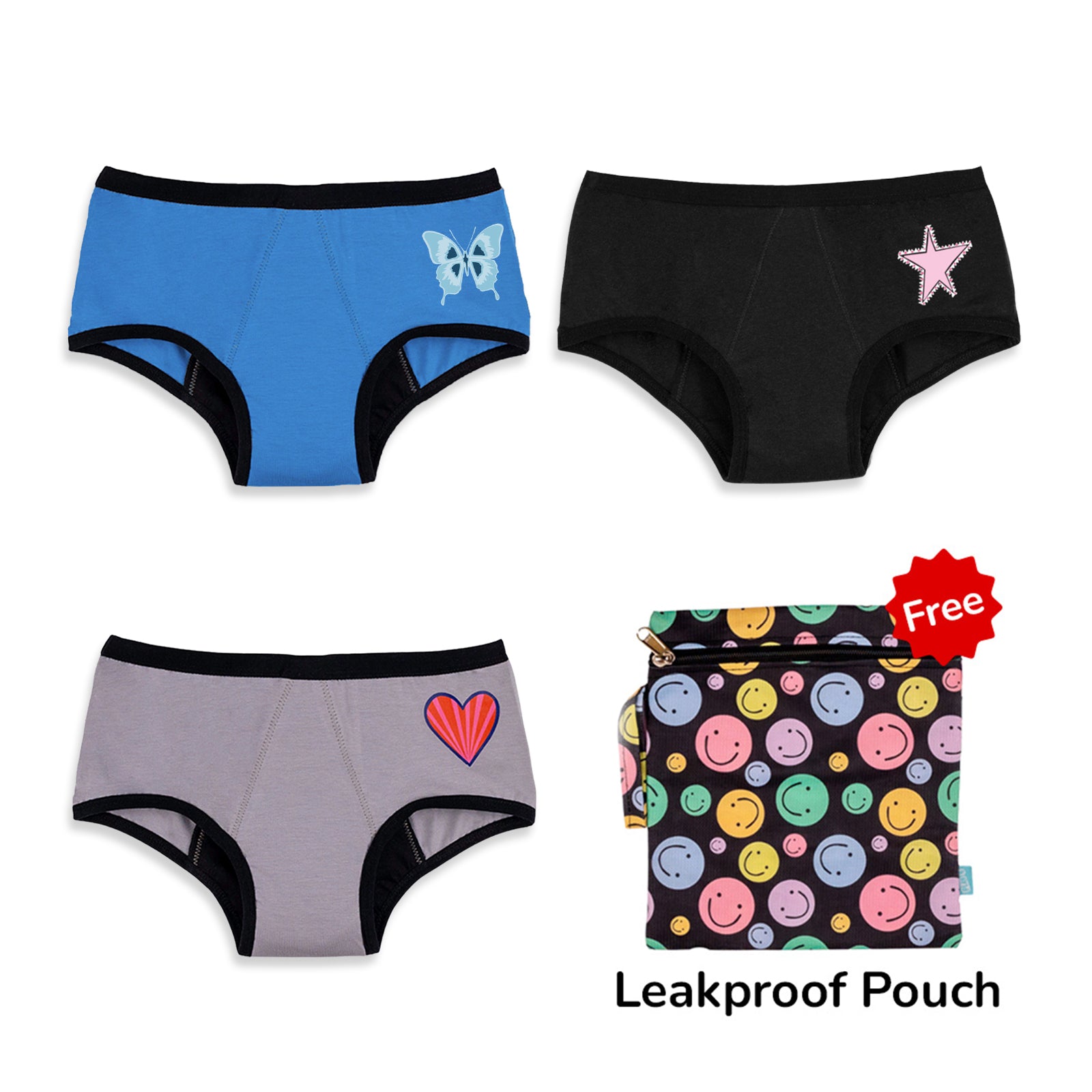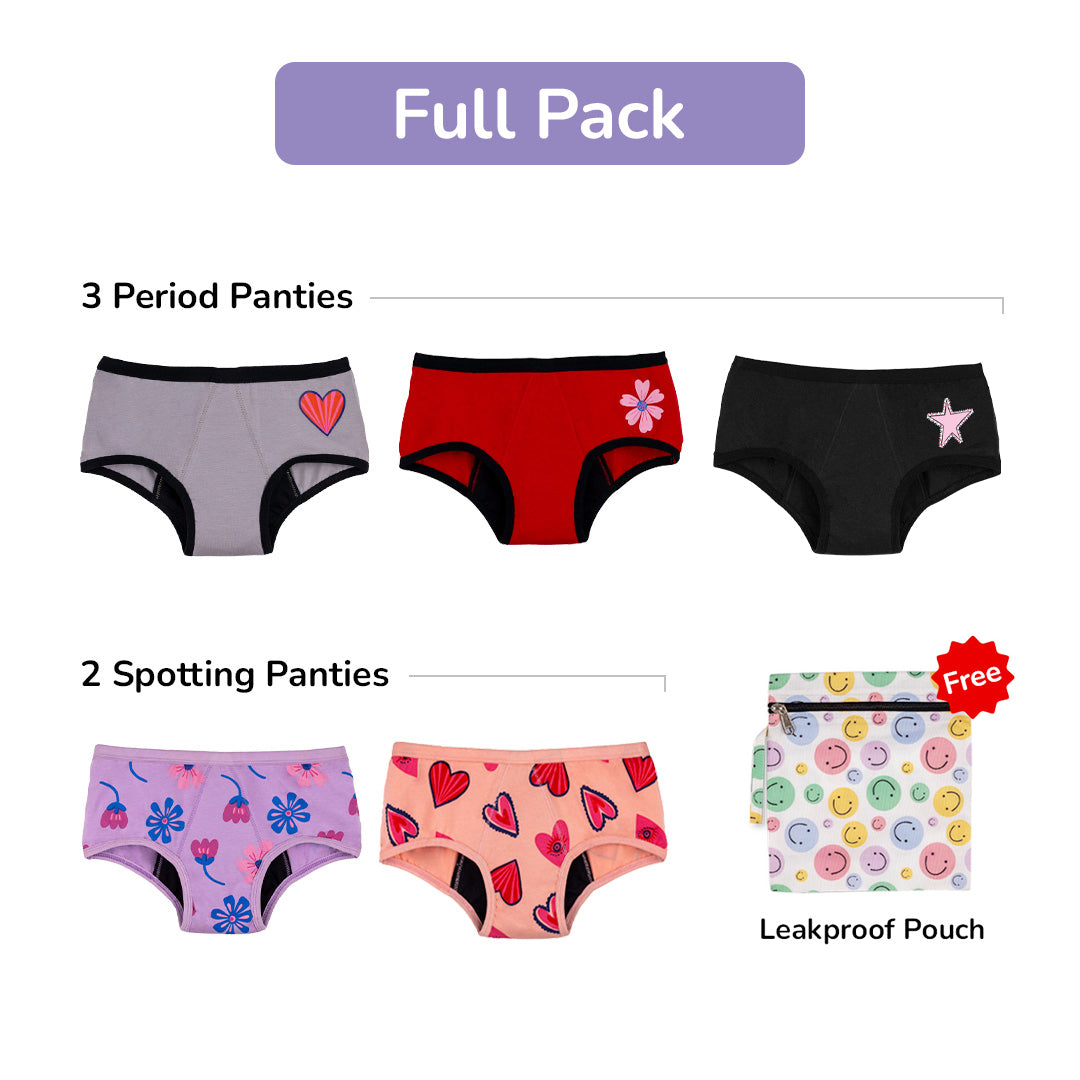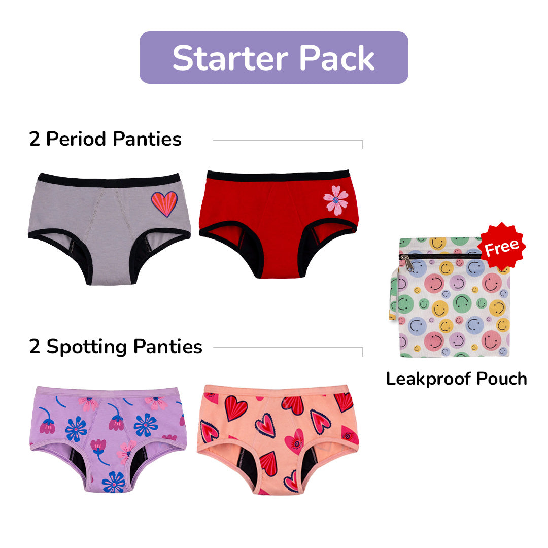 - Starter Pack Reusable Period & Spotting Panty: If your daughter is just starting her period journey, then this starter pack simplifies everything. It includes two reusable period panties for those heavy days and two lighter ones for spotting. Plus, a waterproof pouch to store used panties- how convenient is that? The leakproof design, along with anti-odour and anti-microbial features, makes sure your pre-teen stays fresh and comfortable, whether they’re at school or at home. All you need is this simple, efficient set to start their school days and daily activities stress-free.