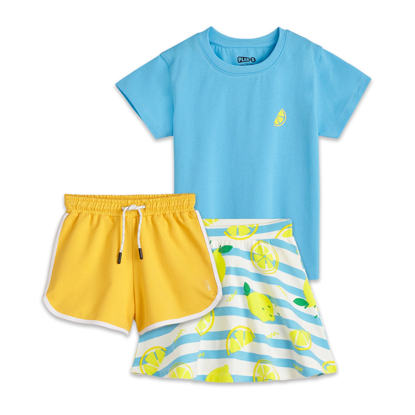 Blue Tshirt with Runner Shorts & Skater Skirt Set