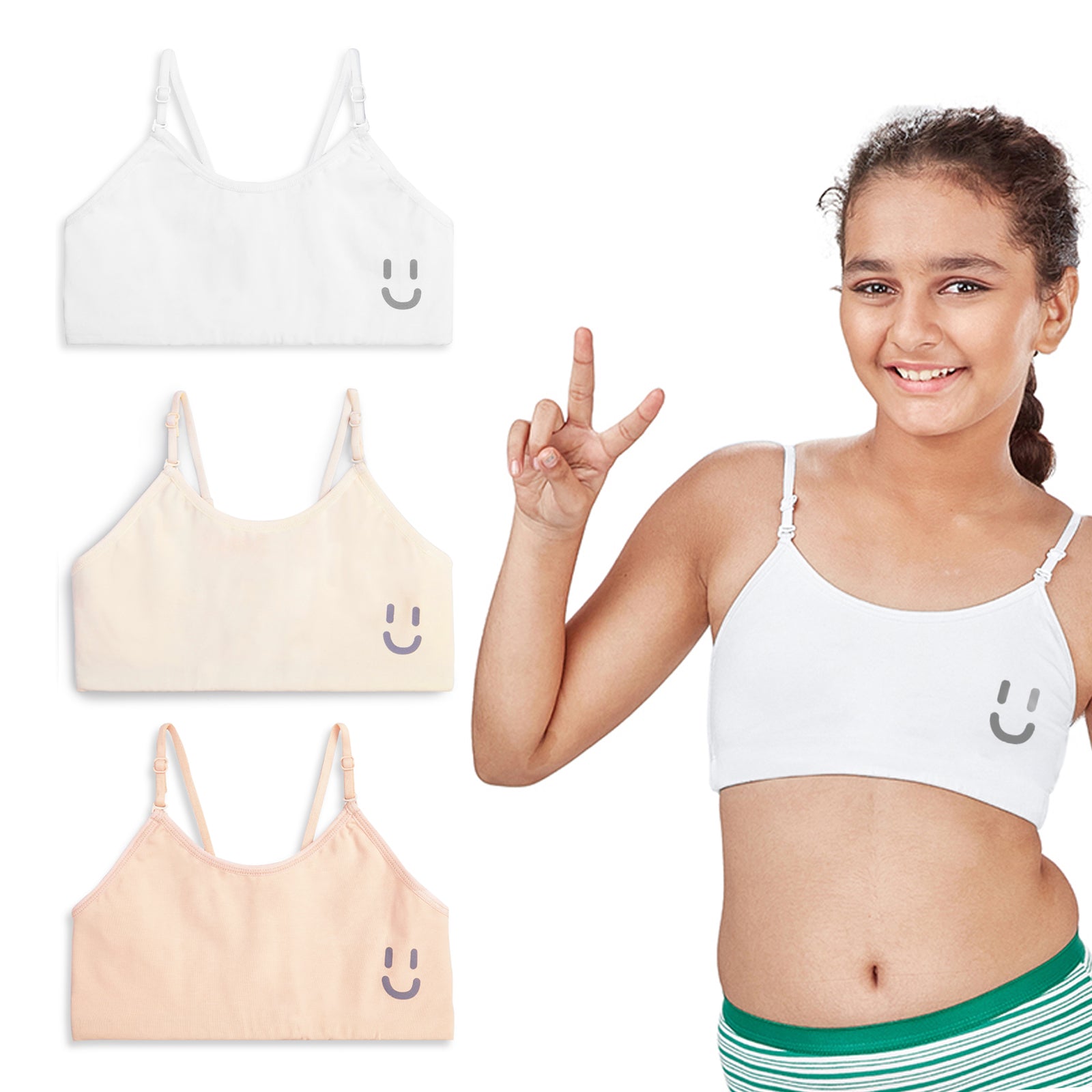 - Smiley 3-Pack Training Bras: A smiley to brighten up your day? Oh yes! Our cute, pastel-coloured, 3-pack of beginners bras comes with adjustable convertible straps for a custom fit. The scoop neck and non-padding, wire-free design make it comfortable for all-day wear, and the smiley face designs bring cheer to any outfit. Our client Runa Ganguly says, “...The bra is soft and durable. It is very easy to wear and material is very nice...”