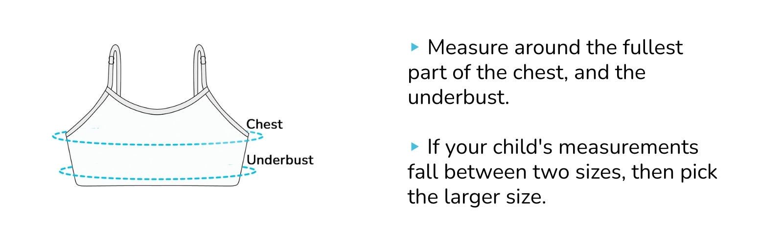 Start by measuring the underbust snugly, then measure around the fullest part of the chest. Use these measurements with Plan B's training bra size chart to find the right size for first-time bra wearers.