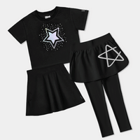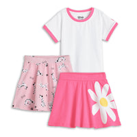 This 3-in-1 set includes a skater skirt, skeggings and a matching T-shirt, all crafted from cotton.