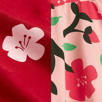 Design Note : Red flower print on a peach skirt, paired with a red t-shirt with a matching flower print