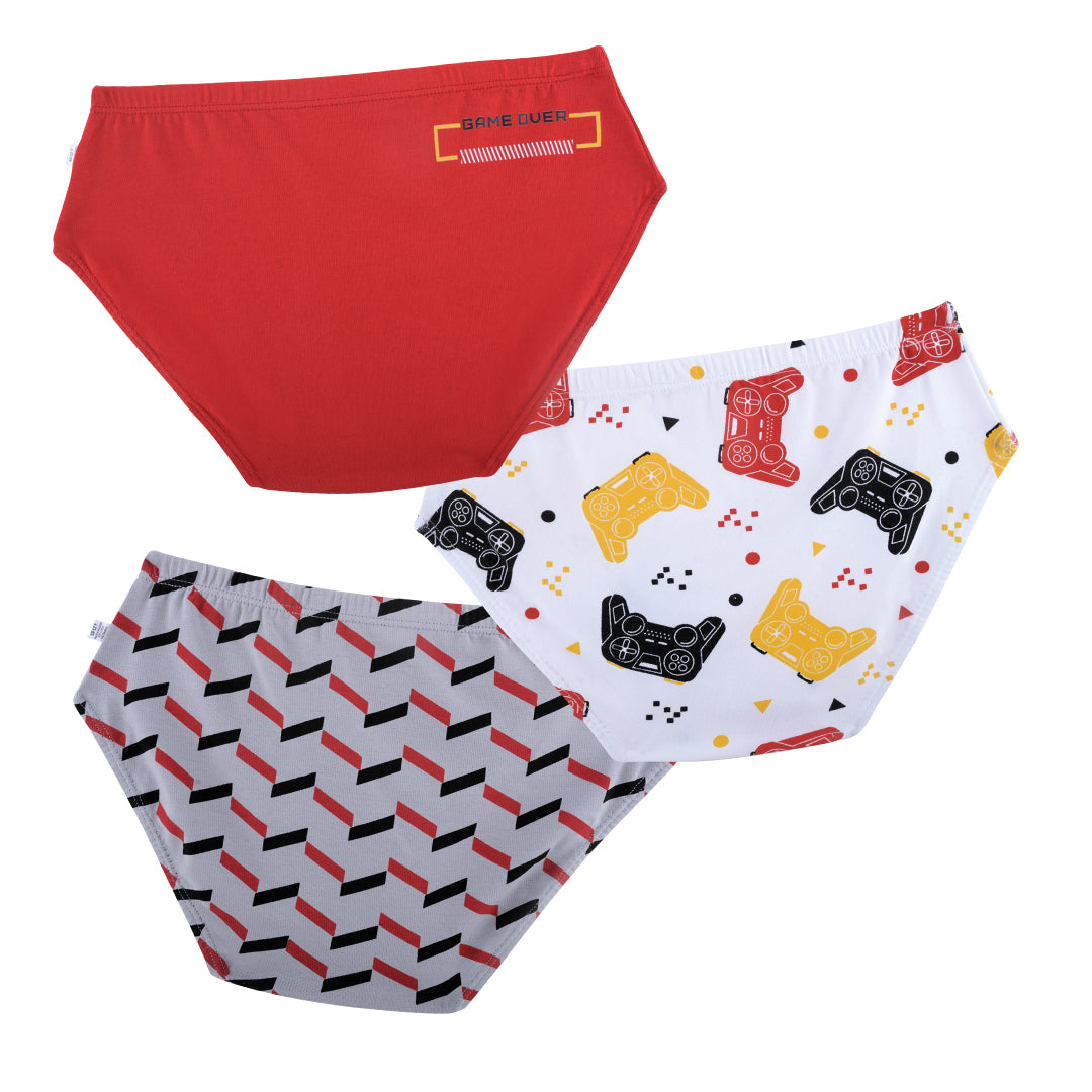 Design note: Video game motif all-over and piece print on white, grey and red briefs.