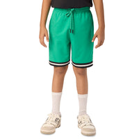 Design note: Green shorts with white and black varsity stripes on the hem.