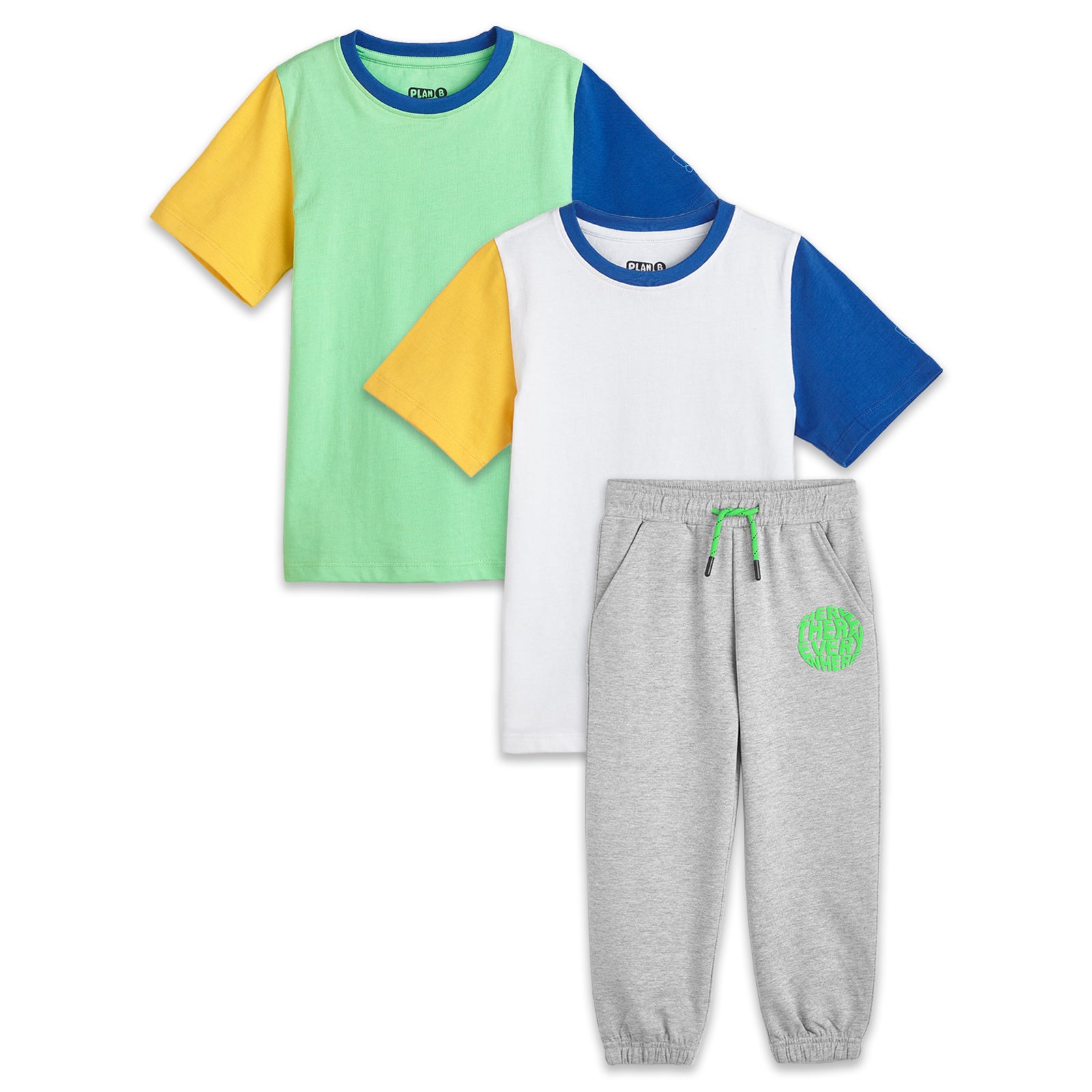 Product Design Note: A green t-shirt with a cute snowman, a reindeer, and a stylized Christmas tree outline print.