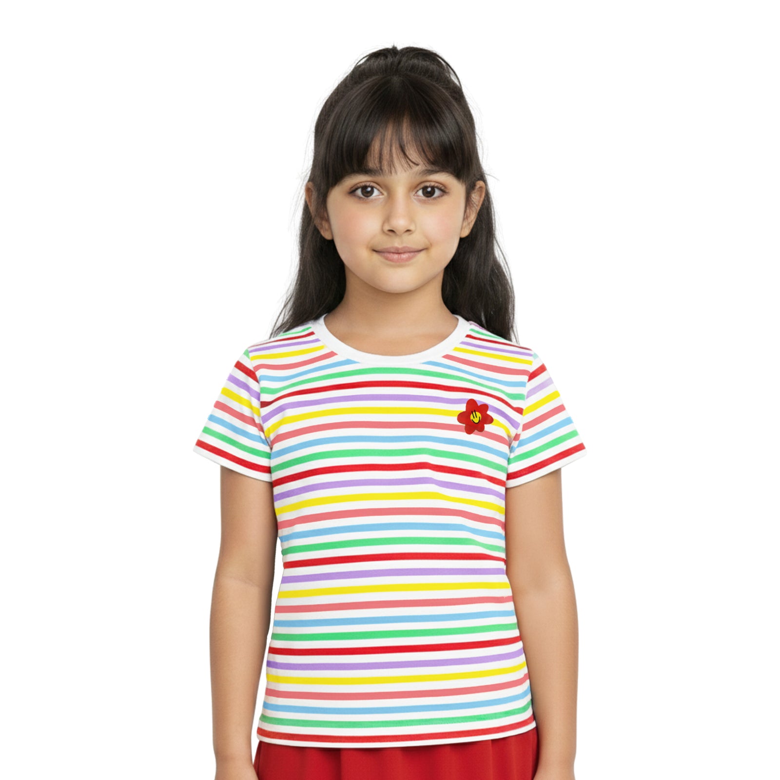 Multi-colour striped t-shirt, made with a cotton blend that lets your child’s skin breathe free. Its ‘just-right’ fit won’t hang loose or tight. Designed to be comfortable and pair well with shorts, jeans, skirts and even dungarees.