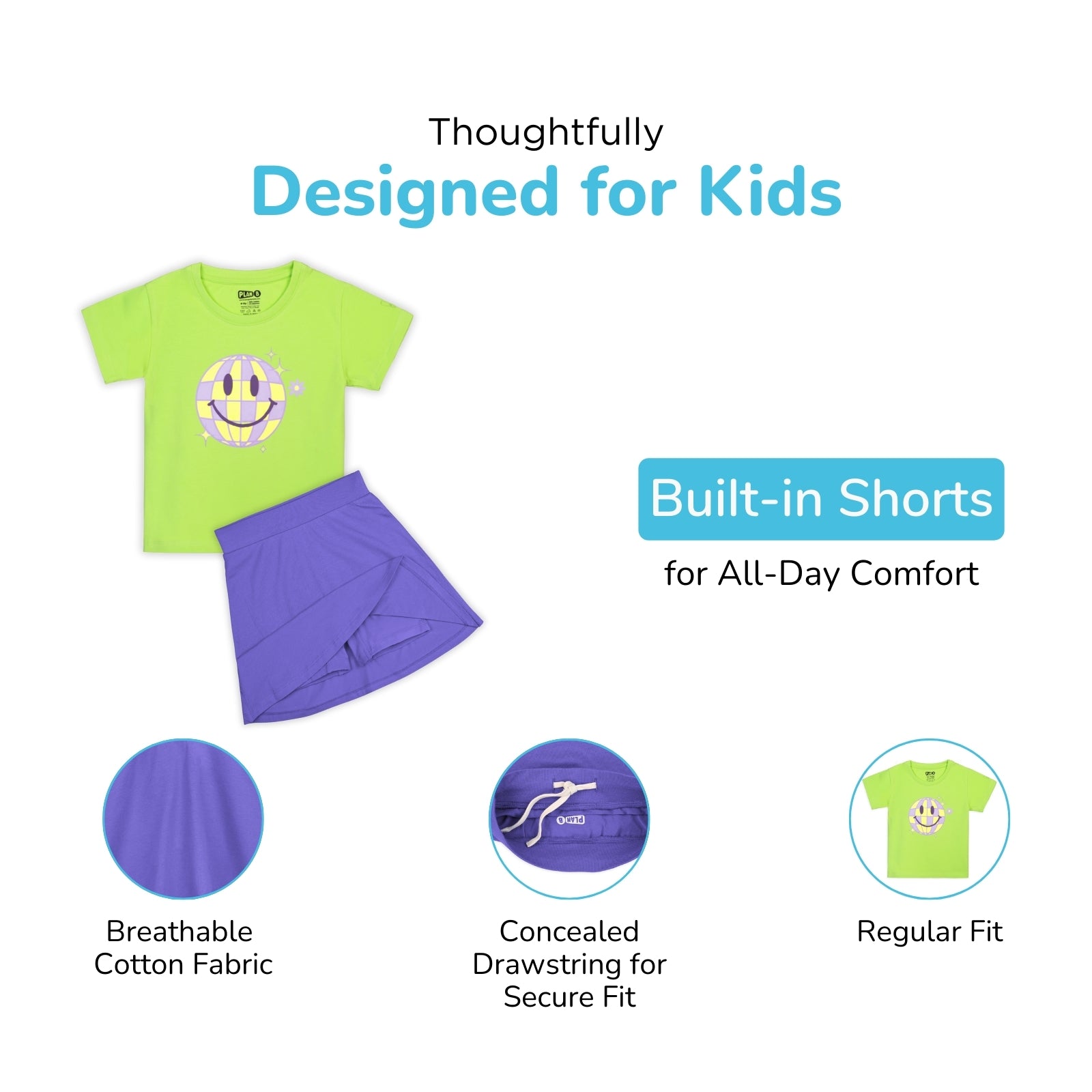 A cotton skirt with built-in inner shorts, paired with a relaxed-fit t-shirt. The skirt ensures mid-thigh coverage no matter how your child sits or moves. The stretchy inner shorts are designed to function like underwear (with 100% cotton inner lining).