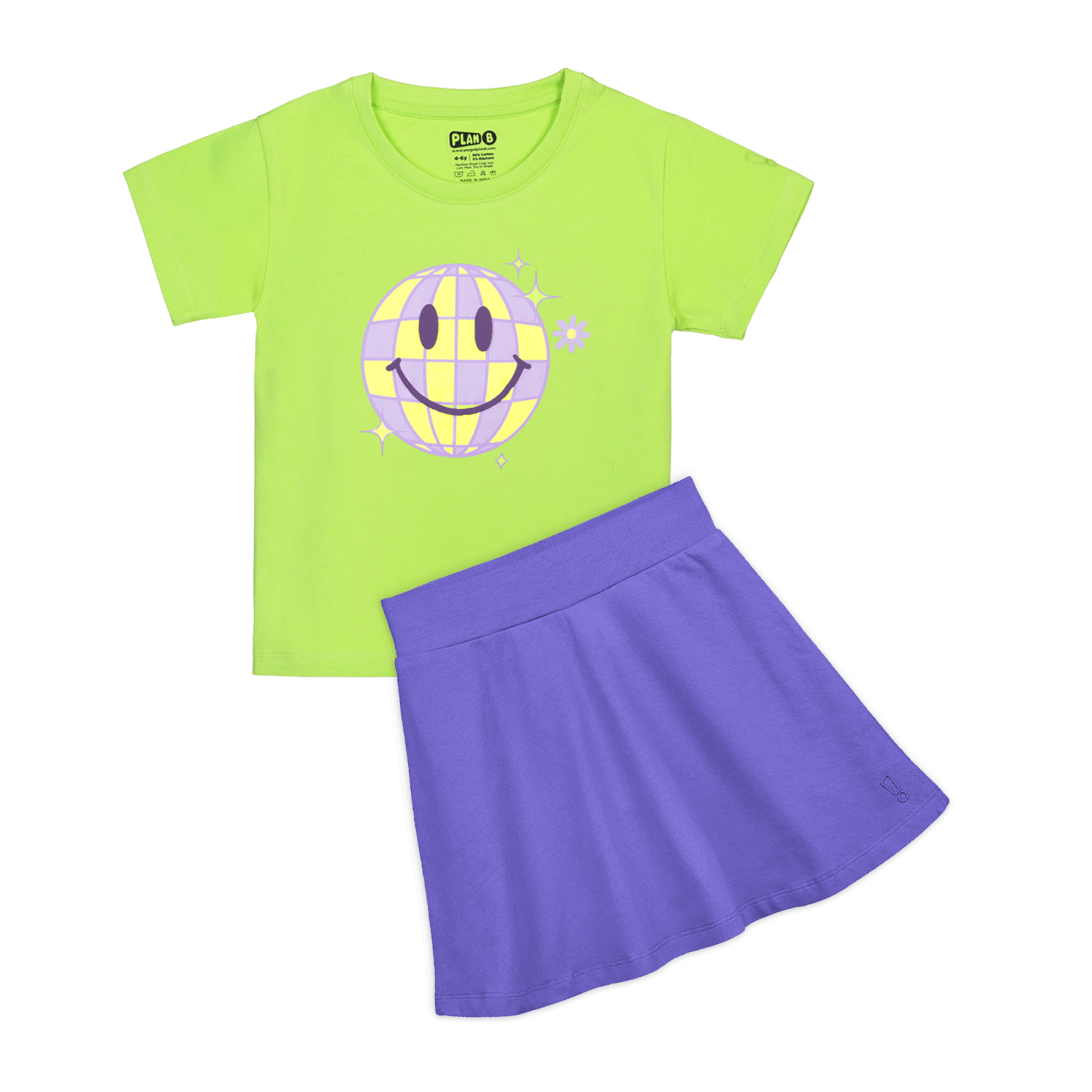 Design Note : Purple skater skirt paired with a light green t-shirt featuring a smiley print.