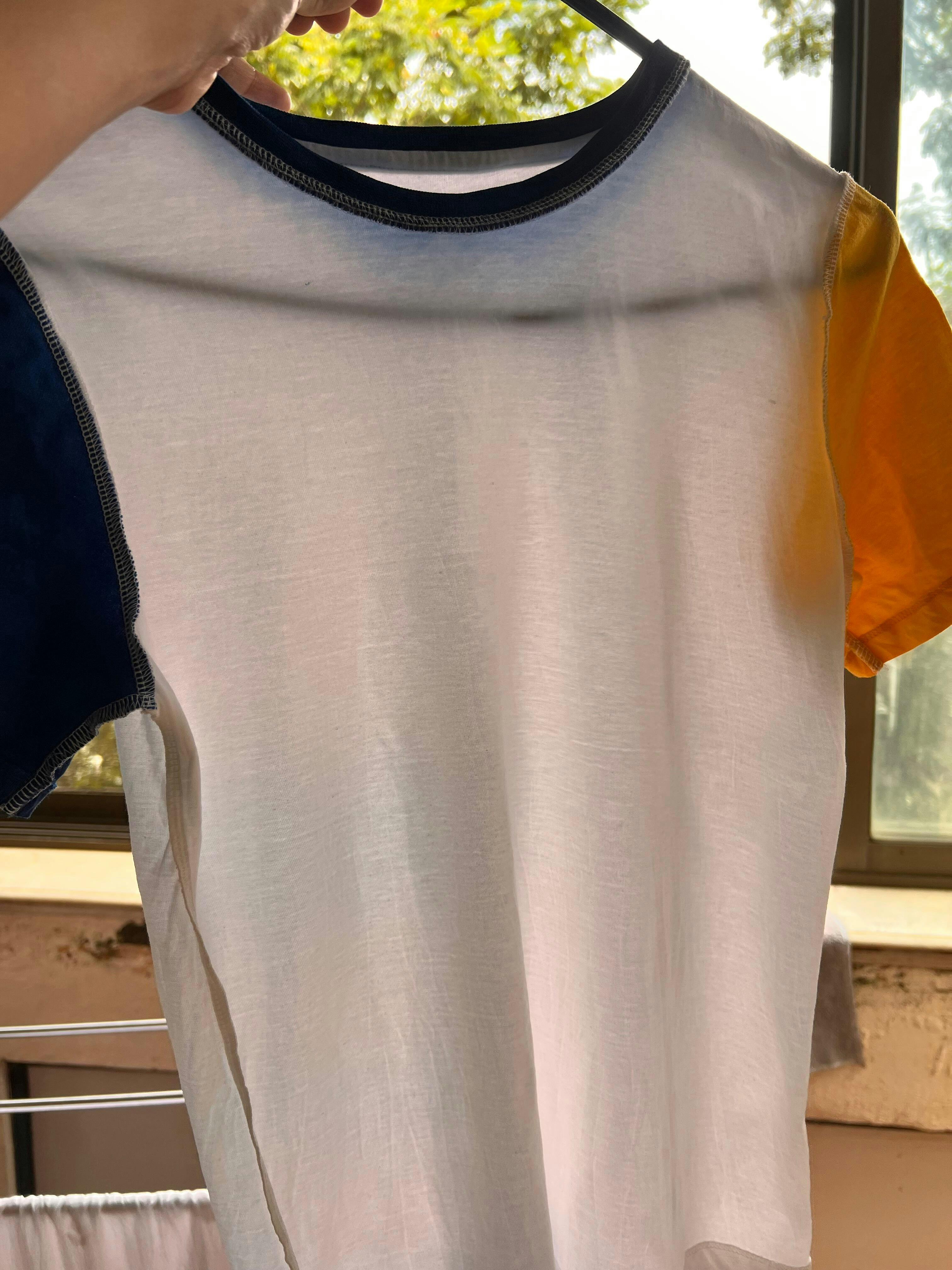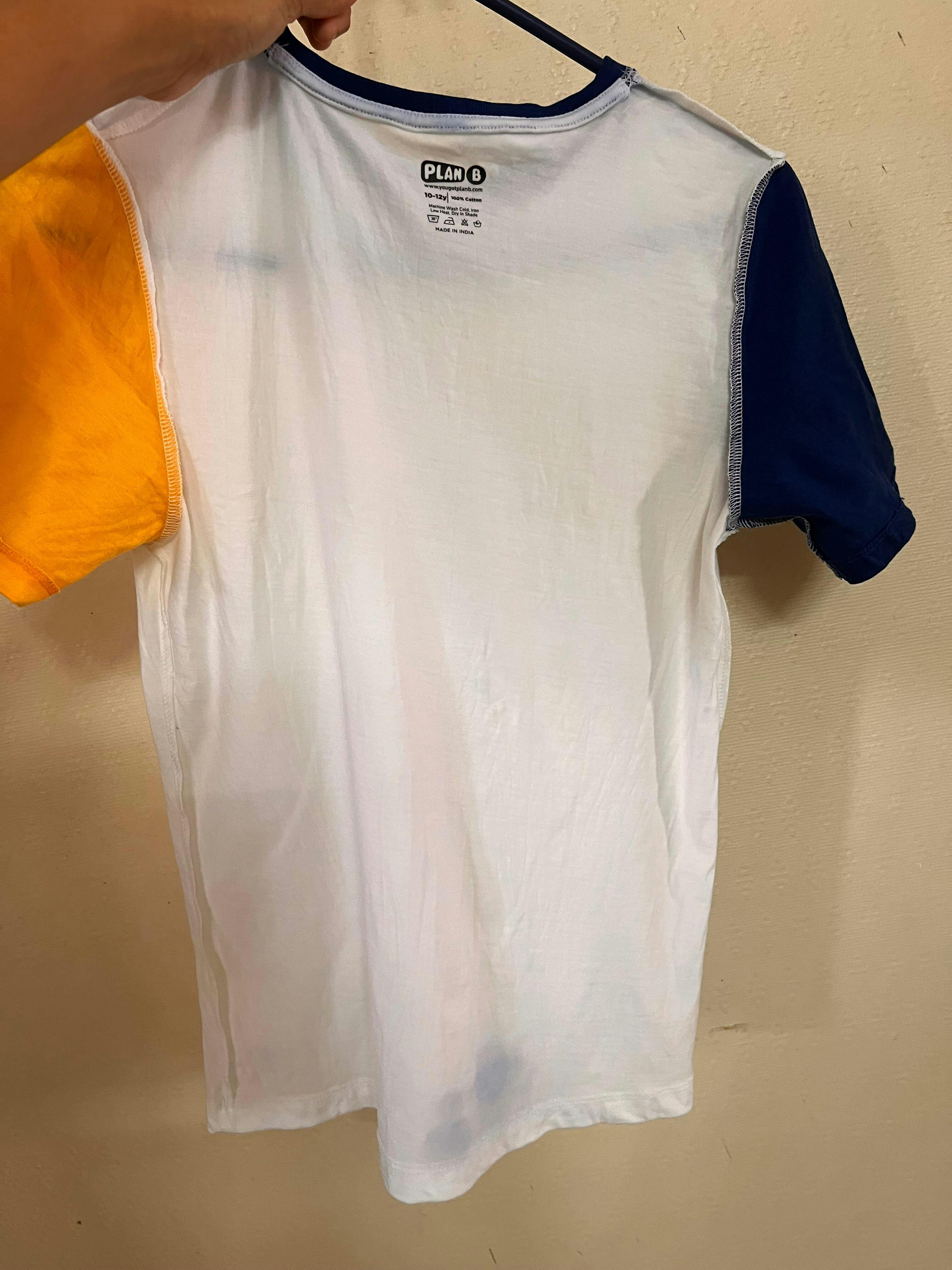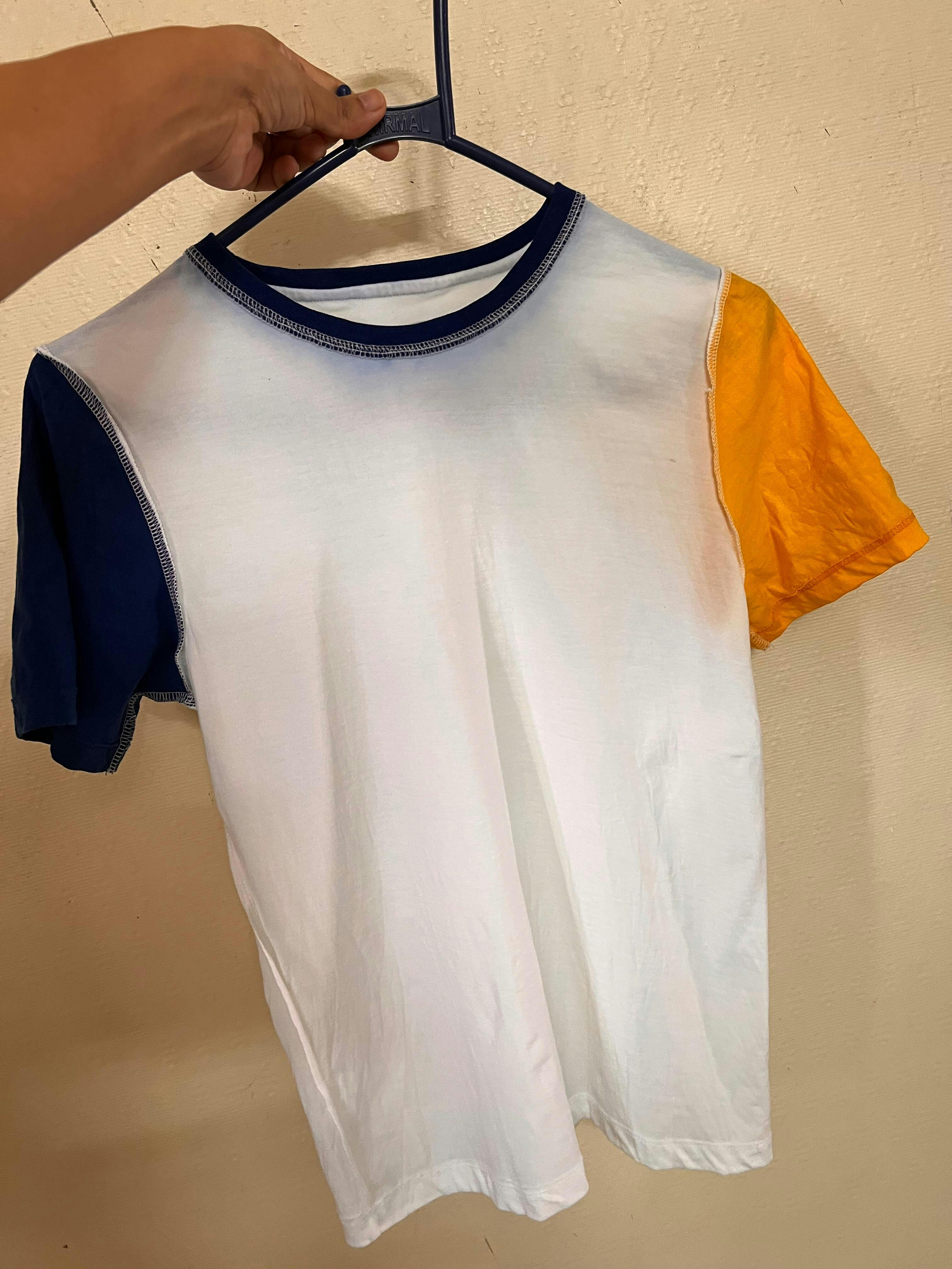 Design note: A green tshirt with yellow and blue colourblocking & a white tshirt with yellow and blue colourblocking, paired with a grey melange joggers with neon green typographic HD print on the left thigh.