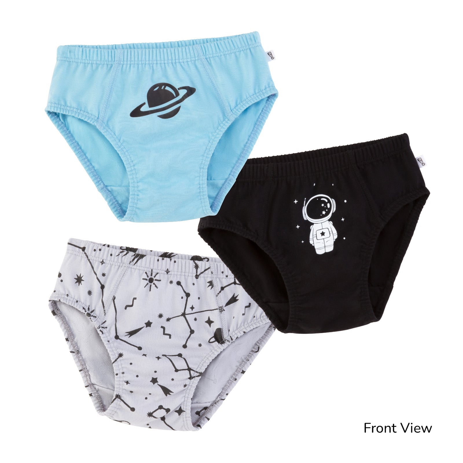 Design note: Space-themed motif on light blue, grey and black underwear.