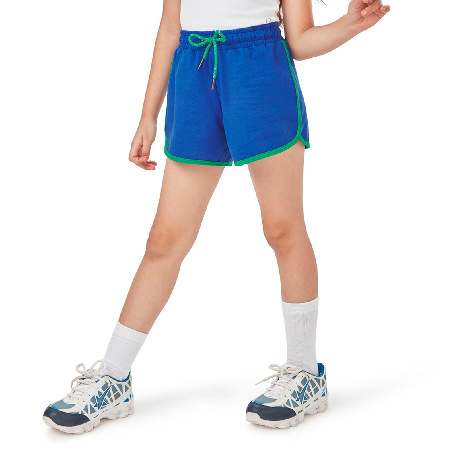Sporty cotton runner shorts for girls. Crafted for non-stop fun. Stretchy with a relaxed fit, these are perfect for all-day wear, be it naptime or playtime. They have an elasticated waistband, drawstrings and contrast piping for a sporty look. An absolute everyday essential for your little one. Best paired with tshirts and tank tops for girls from Plan B.